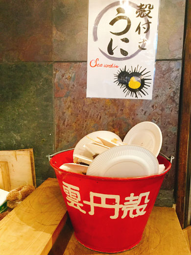 店の端に備え付けてある、殻入れの赤いバケツがなかなか味わい深い。