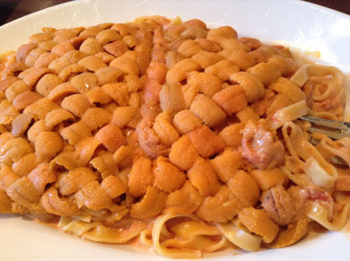 ウニパスタを注文すると大抵、パスタが盛られたてっぺんに申し訳程度のウニが2つ3つお上品に乗っている。パスタソースのほうにウニが使われているとはいえ、固形物としてのウニの量はあまりに少ない。