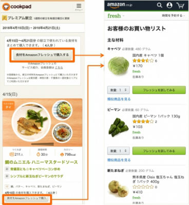 Amazon.co.jpの生鮮食品・日用品まとめ買いサービス「Amazonフレッシュ」が、レシピサービス「クックパッド」「DELISH KITCHEN」との連携を発表しました。