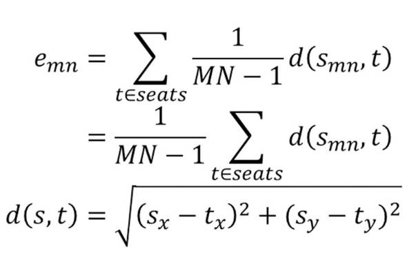 e(添字は席の位置)は各席における気になる人との距離の期待値、d(s,t)は2つの席s(教室の横方向にs_x、縦方向にs_yの位置にある)、t(sと同様)間の距離。