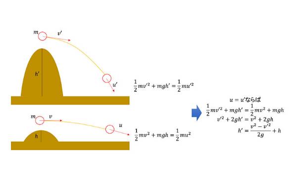 一方、やたら高いマウンドから投げる素人についても、球速と高さについて同じ関係が成り立つ。ホームベース地点の球速が同じになるように投げるとすれば、大谷選手の投球と素人の投球を等式でつなぐことができる。ここからマウンドの高さを算出すれば良い。