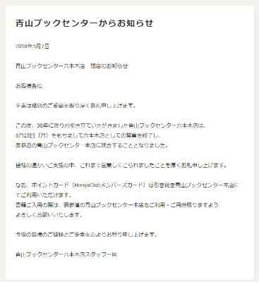 同日から表参道の青山ブックセンター本店に統合されることになります。ポイントカード(HonyaClubメンバーズカード)は引き続き青山ブックセンター本店で利用できるとのこと。