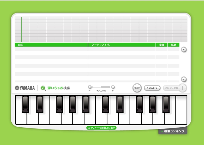 「弾いちゃお検索」はそもそも、「メロディはおぼえているけど、曲名が思い出せない」というときにメロディを弾くと、似たメロディの楽曲名が表示されるというアプリ。PC版と「歌っちゃお検索」という名前でスマホ版がリリースされています。