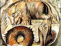 イギリスの画家ウィリアム・ブレイク(1757〜1827)による絵画。画像下のうろこのある生物がリヴァイアサン、その上にいるのがベヒーモス