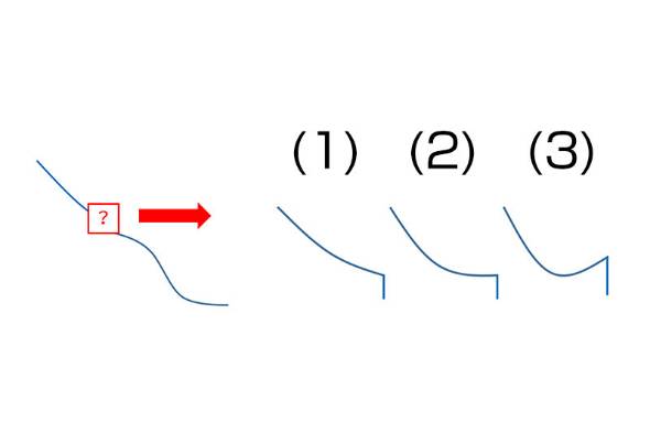 問題です。次の図はスキージャンプのジャンプ台を横から見た図を表しています。「?」に入る「ジャンプ位置」を表す形は(1)〜(3)のどれでしょう?