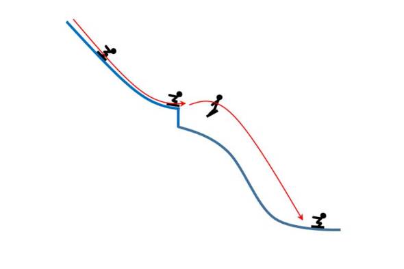 スキージャンプといえば、どうしても(3)のような台からこんな軌道を描いて飛ぶイメージがある。