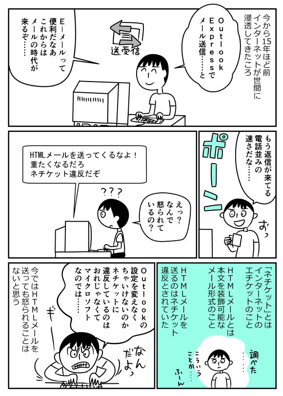 インターネットが一般に浸透しはじめたころ。ネット上で人とやりとりするときに使うマナーは「ネチケット」と呼ばれていました。「HTMLメールを送らない」もネチケットの1つでした。