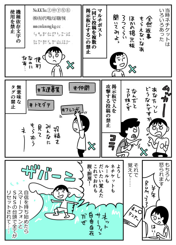「マルチポストの禁止」「機種依存文字の禁止」……。ネチケットにはさまざまな物がありました。人と人とがやりとりする空間なので、こうした決まり事は確かに必要といえるでしょう。しかし、こうした決まり事も数年たつと状況が変わって、今では通用しなくなってしまいました。