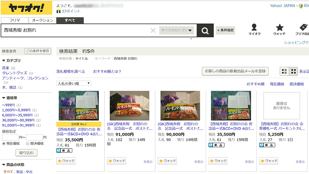 そんな中、この「お別れの会」の記念品が「ヤフオク!」に出品されていることが明らかとなりました。出品されているのは「西城秀樹さんありがとうポストカード」「お礼状」「西城秀樹さんの還暦記念CD(心響-KODOU-)」「ハウス食品のバーモントカレー」のセットで、5月28日時点で複数の出品が確認されています。