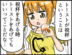 パンのイメージが浮かんでしまうと違和感を覚えますが、例えば、「drink a toast」というのどに詰まりそうな表現は「乾杯する」という意味になります。