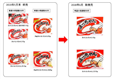 「カットよっちゃん(当たり付き)10g」(希望小売価格30円)に加え、「カットよっちゃん10g」「カットよっちゃんしろ10g」(同30円)、「Bigカットよっちゃん25g」「Bigカットよっちゃんしろ25g」(同60円)も販売終了となり、6月から新たに「カットよっちゃん15g」「カットよっちゃんしろ15g」を希望小売価格50円で販売します。