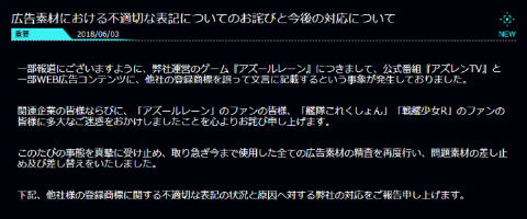 これらは監修時のチェックミスが原因と説明し、「関連企業の皆様ならびに、『アズールレーン』のファンの皆様、『艦隊これくしょん』『戦艦少女R』のファンの皆様に多大なご迷惑をおかけしましたことを心よりお詫び申し上げます」と謝罪しています。