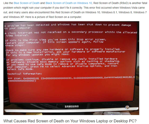 レッドスクリーンは果たして、Vista以外にも搭載されているのか―― 情報が錯綜しており曖昧な点もありますが、ただ一つ言えるのは「とにかく見たくない」ということ。というのも、「レッドスクリーン」は、英語で「Red Screen of Death(死のレッドスクリーン)」という恐ろしい名前で呼ばれているのです。