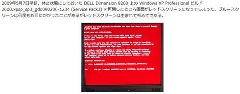 日本国内での報告事例。この方はWindows XPでレッドスクリーンが出たとのこと