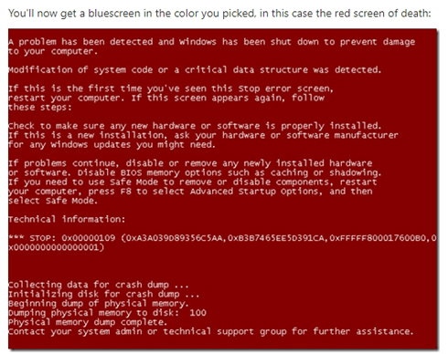まあ、「ブルースクリーン」の英語名も「Blue Screen of Death(死のブルースクリーン)」なので、画面が赤くなろうと青くなろうと、「パソコンの死」に直面せざるを得ないのですが……。