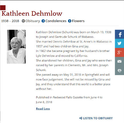 注目されたのは、ミネソタ州レッドウッド・フォールズの地方紙Redwood Falls Gazetteに掲載された、80歳で亡くなった女性の死亡記事でした。5段落の短い記事で、初めは女性の出身地や、結婚して2人の子どもをもうけたことが書かれています。しかしその後は「夫の兄弟の子どもを妊娠し、カリフォルニアに移住」「彼女は子どもを捨て、子どもは彼女の親に育てられた」と不穏さを感じる記述が。