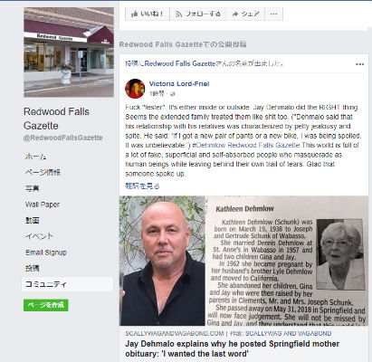 この記事を掲載したことに対し、Redwood Falls GazetteのFacebookページには「掲載を認めたことを恥じるべき」「こんな死亡記事を載せるなんて信じられない」と批判が寄せられました。同じ記事が訃報サイトlegacy.comにも掲載されていましたが、批判を受けて削除されています。一方では、「検閲せずに載せたことを称賛する」と肯定的な意見や、「死亡記事は生きている人のためのもの」と記事を書いた子どもに同情的な声もみられました。