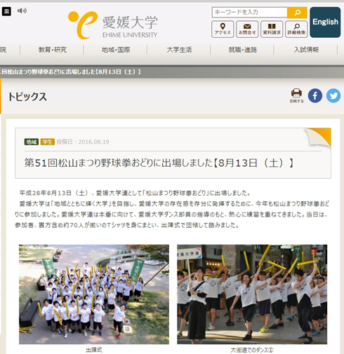 愛媛大学公式サイト。野球拳おどりに参加したことが掲載されています