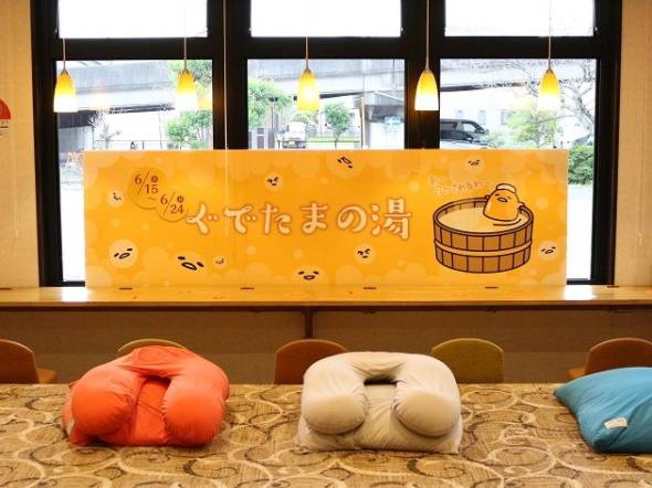 期間中は、ぐでたまをイメージしたお風呂が登場。2店舗合計で1万個のぐでたまのボールがぷかぷかと浮かびます。オリジナル入浴剤はたまごを使ったお菓子をイメージしたもので、見た目も香りもぐでたまワールドを楽しめそう。館内はさまざまなスポットにぐでたまの装飾がある“ぐでたま仕様”となっています。