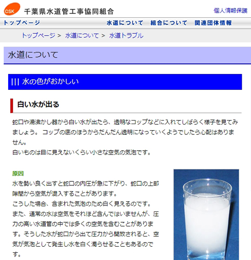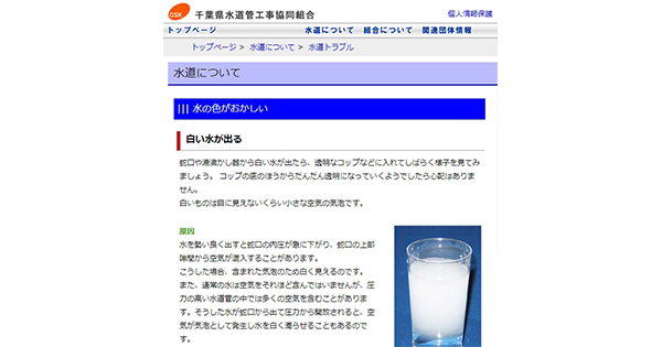 千葉県水道管工事協同組合による解説。「気になる場合は水道をしばらく流しっぱなしにしましょう」としており、亜鉛が多量でない場合は「人体に影響はありません」とのこと
