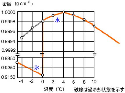 水の密度変化のグラフ。4℃、つまり、液体のときに密度が最大になります(文部科学省より)