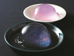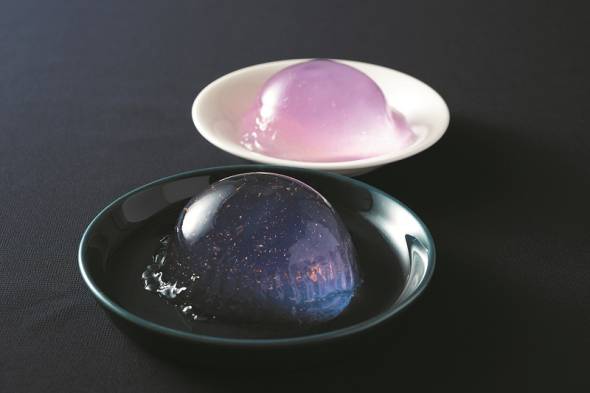 ローソンは3月、はやぶさ2の応援企画として小惑星リュウグウをイメージした「スイーツアイディアコンテスト」を実施。応募作の中から商品化が決定したのがぷるるん水ゼリーです。ハーブティー「バタフライピーティー」にレモンを加えた、ピンクがかった薄紫色のゼリーとなっています。商品パッケージの黒トレーの上では色が変わって、宇宙のような色合いに見えるという仕掛けも。