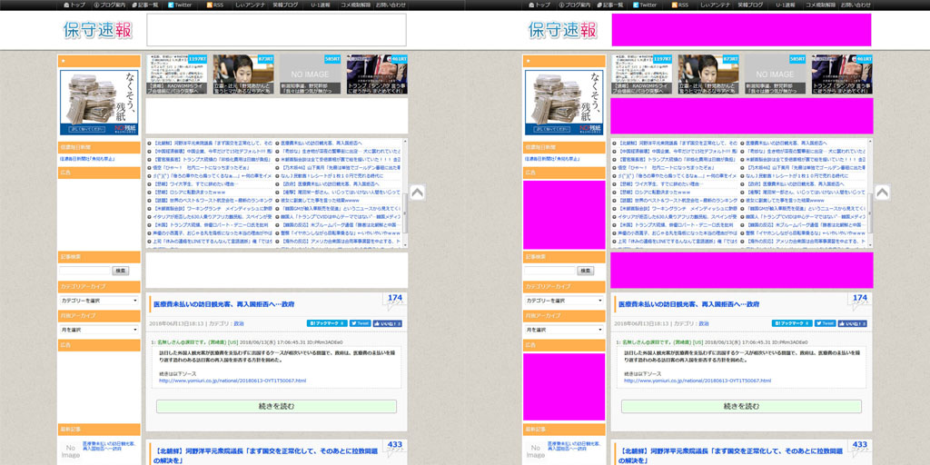 一切の広告が撤去された「保守速報」トップページ(右はこれまで広告が表示されていた箇所)