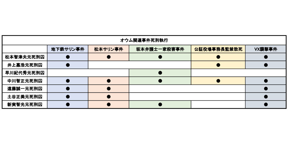 オウム真理教の教祖、麻原彰晃こと松本智津夫元死刑囚の死刑が7月6日午前、執行された。同日には、井上嘉浩元死刑囚、中川智正元死刑囚、早川紀代秀元死刑囚、遠藤誠一元死刑囚、土谷正実元死刑囚、新実智光元死刑囚らの死刑も執行された。同一事件による7人同日執行は今回がはじめて。