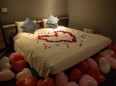 その中にちょっと驚きのオプションがありました。「生バラとバルーンによるお部屋のデコレーション」では、なんとお部屋のベッドに生バラ、そして部屋中にハートのバルーンが……これはぜひ、写真を見てください。どうですか、この堂々たる月9感!