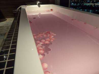 今回、浦安ブライトンホテル東京ベイの「The POOL BATH」と呼ばれるお部屋に、このオプションが利用されている様子を再現してもらいましたが、部屋に入った瞬間に驚きの空間が拡がっていました。さらにこのお部屋では、夜景を見ながらプールのようなお風呂に入ることができ、そこにもオプション「生バラによるフラワーバス」(★3個)が展開されていました。「The POOL BATH」は角部屋で、遠くには東京スカイツリーも見えるのです。