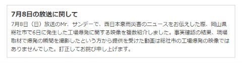 フジテレビは、7月8日放送の「Mr.サンデー」で岡山県総社市のアルミ工場爆発事故として紹介した映像が、実際は当該事故の映像ではなかったとして謝罪しました。