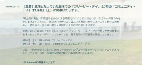 豪雨により延期になっていた「Pokemon GO(ポケモンGO)」のイベント「フリーザー・デイ」「コミュニティ・デイ」が8月4日に開催されると発表されました。
