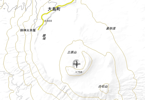国土地理院の地図を見ると、三原山の東側に「裏砂漠」。ここでは表示されていませんが、山の西側(つまり、裏砂漠の反対側)には「表砂漠」と呼ばれるエリアがあります