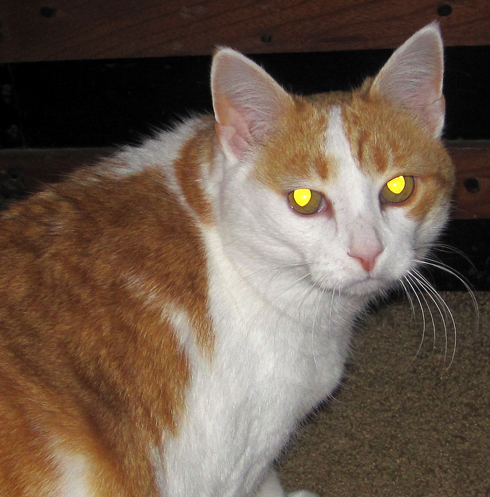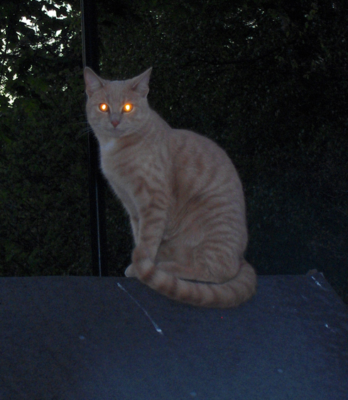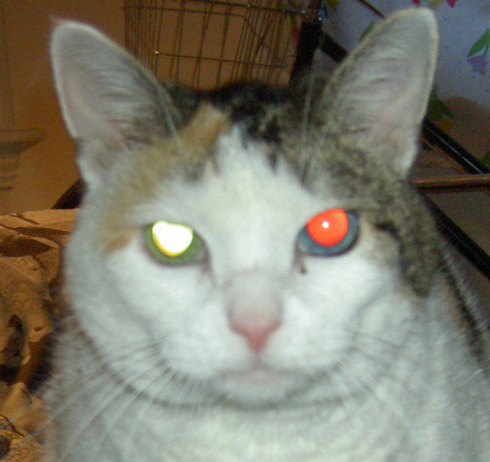 暗い場所でフラッシュ撮影をしたとき、猫の目が光る現象も原理的には赤目現象と一緒。しかし、タペタムが反射板のような役割をするため、目が光を放っているような写り方になるのだといいます。