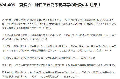 「棒状の発光玩具をパキッと折ったり曲げたりして遊んでいる時に液漏れした」「(おもちゃの)ボタン電池を誤飲した」など、子どもに買い与えた玩具などによる事故情報が寄せられていると同庁。ボールすくいなどで販売されている、水を吸うと膨らむボール状の玩具も、誤飲事故が発生したことがあるとしています。