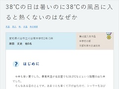 あまりにも熱くて汗が出たある日、シャワーを浴びて「お湯の温度は38度なのになぜ熱いと感じないのか」と疑問に思ったところから研究が始まりました。そこで、「風呂の場合は頭が38度のお湯の中に入っていない」「風呂の場合は服を脱ぐが、気温の場合は着ている」「水の熱伝導率は空気と比べ25倍ほど大きい」「風呂は入ってる時間が3分から10くらいだが、気温は数時間に及ぶ」など、風呂と気温の違いをあげ、検証が始まります。