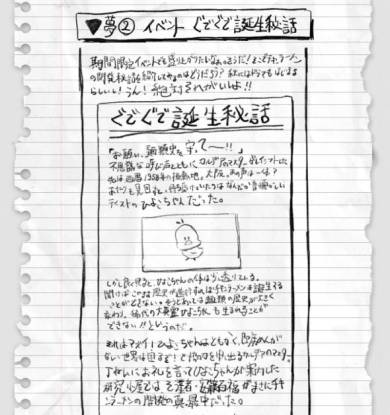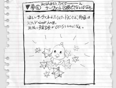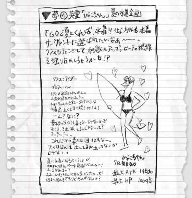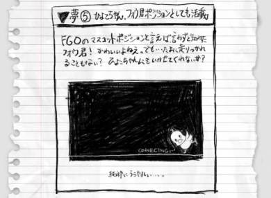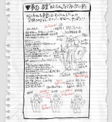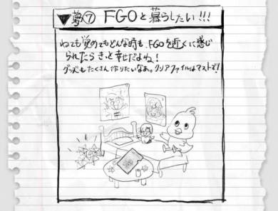 さらにひよこちゃんの夢はとどまるところを知らず、「期間限定イベント『ぐでぐで誕生秘話』」「概念礼装(キャラの性能をアップさせる補助カード)『チキンラーメン』と『ローソン』」「夏の水着企画」「フォウくん(作中のマスコット的キャラクター)ポジションになりたい」「無限に英霊召喚(ガチャ)がしたい」「グッズもたくさん作りたい、クリアファイルはマストで!」などと好き放題に書いています。欲張りすぎだろこの黄色いの。