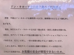 ドン・キホーテの張り紙は7月3日に掲出されたもの。「7階は防災・保安上危険な状態となっており、New G3に対し一切の営業を禁止するよう通告したが、現在も無断で営業している」「安全が確保できないため、MEGAドン・キホーテ立川店7階の利用を停止する」などと書かれています。