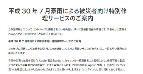 Appleは、平成30年7月豪雨の被災者向け特別修理サービスを発表しました。修理可能な同社製品を無償で配送修理するとしています。