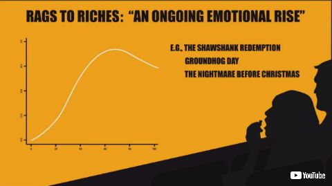 • 「Rags to Riches」(感情がネガティブ→ポジティブへと上昇):作品例「ショーシャンクの空に」「恋はデジャ・ブ」「ナイトメアー・ビフォア・クリスマス」