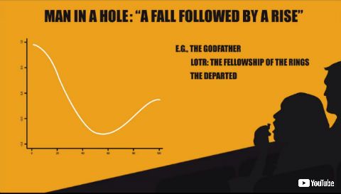 • 「Man in a Hole」(ポジティブ→ネガティブ→ポジティブと下降→上昇):作品例「ゴッドファーザー」「ディパーテッド」「ブレードランナー」