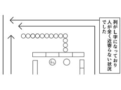 行列の元は、隣のサークルを訪れた参加者たち。並ぶ人が多かったため、列は途中でL字状に折れ曲がり、真紗弥さんの目の前を完全にふさいでいました。このため、列の外側を歩く参加者からは、真紗弥さんのいる島が視界に入りません。反対側から来た参加者も、人波に突き当たると行き止まりだと思い、島から離れていきます。このように、真紗弥さんのサークルへまったく人が近寄らない状況が、40分は続いたといいます。