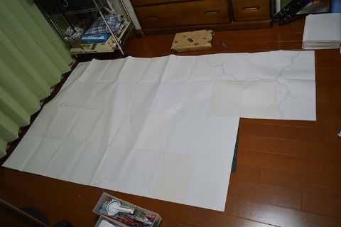 想像地図は、A4用紙をテープでつないでその上にペンで地図を描き(1万分の1縮尺)、それをPCに取り込んで再配置する(このとき10万分の1に縮尺される)ことで作られています。当初は手描きのみでしたが、枚数が増え、描画済みの場所を把握しきれなくなったためPCに取り込み始めたといいます。
