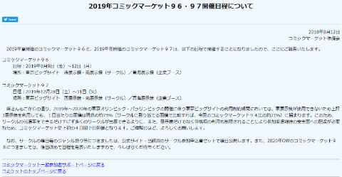サークルのジャンル割りなどは後日公式サイトやサークル参加申込書セットで公開する予定です。2020年GWのコミックマーケット98(関連記事)についても後日あらためて日程を発表するとしています。