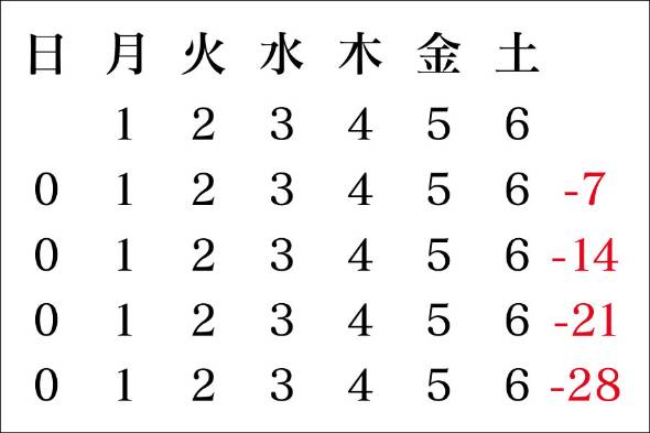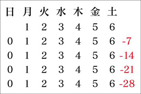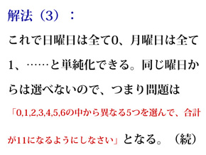 日曜日は全て0、月曜日は全て1、……という風になり、かなりスッキリしました。同じ曜日からは数字を選ばないというルールですから、同じ数字は選べません。