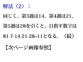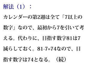 第2週は全て7以上の数字なので、最初から7を引いて考えましょう。代わりに、目指す数字81は7減らしておけばいいのです。