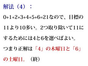 よって、4が書かれている木曜日と、6が書かれている土曜日を選ばないようにすれば81を作ることができると分かります。正解は「木曜日と土曜日」でした。