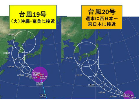 今週は次から次へと台風が日本付近にかなり接近する見込みです。台風19号(ソーリック)と昨夜9時にトラック諸島近海で発生した台風20号(シマロン)。今週はこの2つの台風の動向に注意が必要です。
