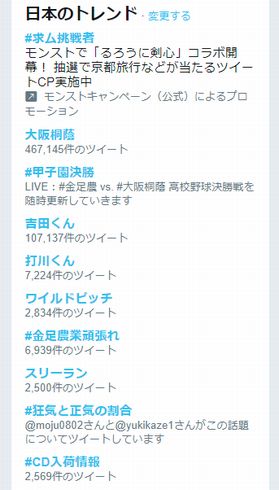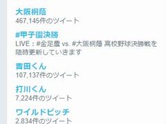 試合終了時、Twitterトレンドを甲子園関連ワードが席巻した