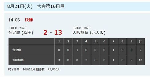 試合は1回裏から大阪桐蔭が3点を先取したのを皮切りに、その後も4回で3点、5回で6点を追加するなど終始試合をリード。金足農業も3回に1点、7回に1点をそれぞれ返しますが、準決勝まで投げぬいてきた絶対的エースの吉田輝星選手が5回12失点で今大会初の降板。最終的には2-13の大差で大阪桐蔭が2度目の春夏連覇を果たしました。